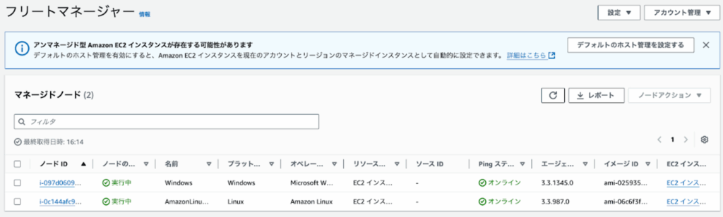 AWS マネジメントコンソールから「Systems Manager」→「Fleet Manager」を選択することで対象のインスタンスが一覧表示されます。各インスタンスをクリックして詳細情報を確認・管理可能です。