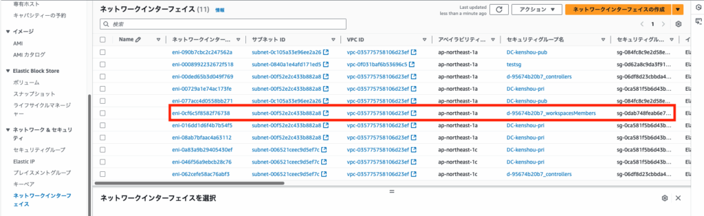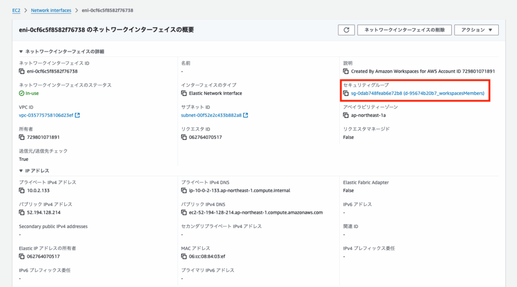 AWSコンソール画面より、WSに割り当たっているENIを探します。