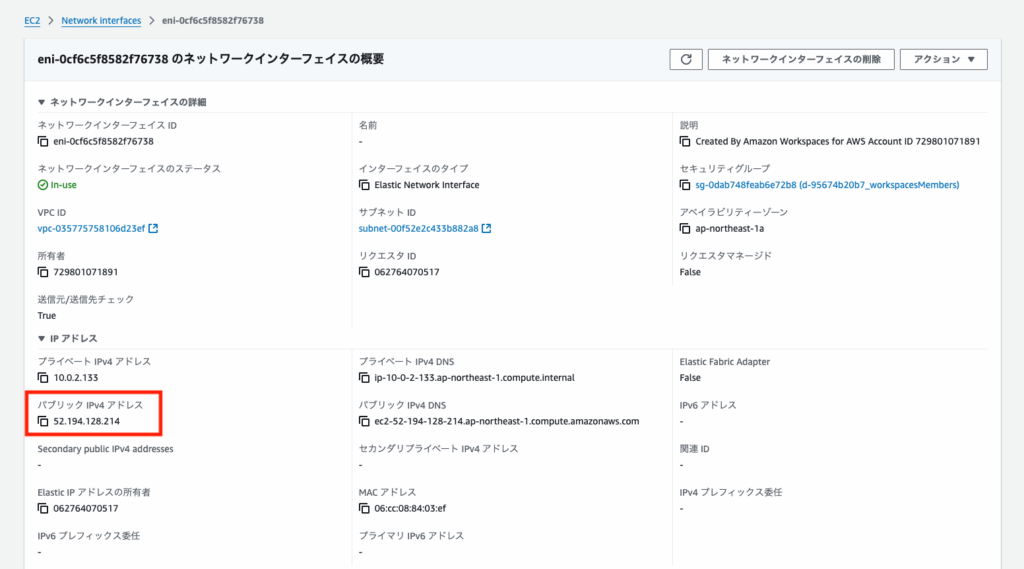 該当ENIに割り当たっているパブリックIPアドレスをメモします。