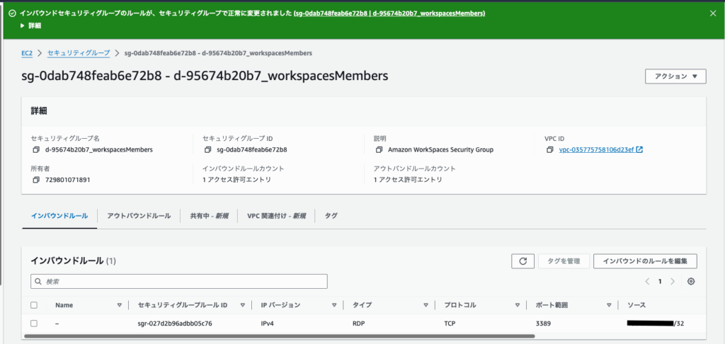 該当ENIに割り当たっているSGにRDT通信の穴を開けます。