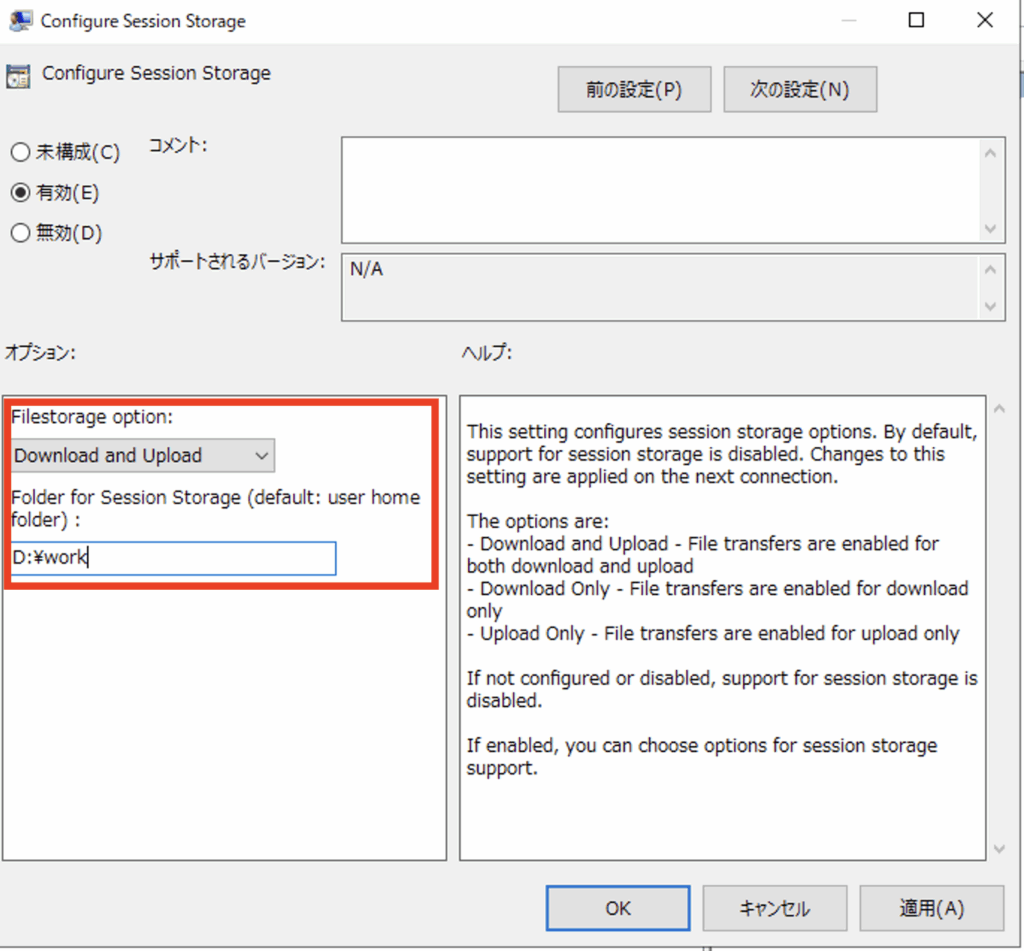 [Folder for Session Storage]には、手順冒頭で作成したファイル転送用フォルダを指定します。