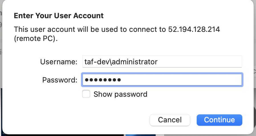 RDTでWSのパブリックIPアドレスにアクセスし、ドメインのadministratorユーザでログインします。