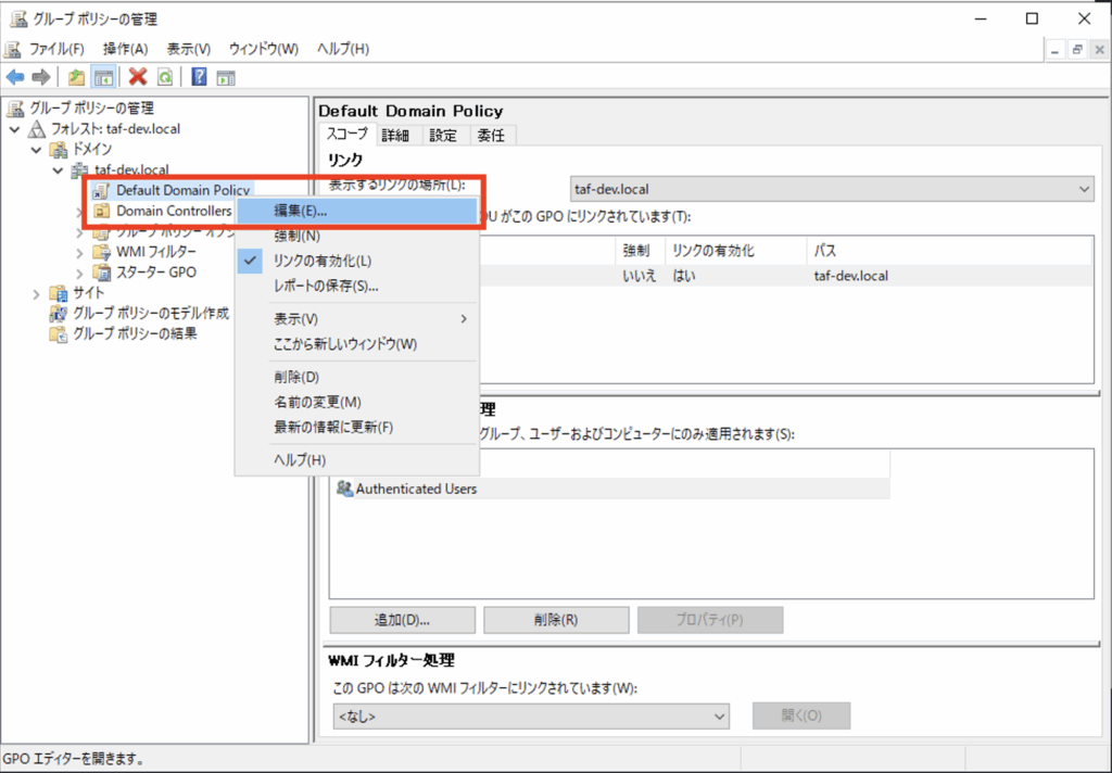 [Default Domain Policy]を右クリックし、表示された右クリックメニューから[編集]をクリックします。