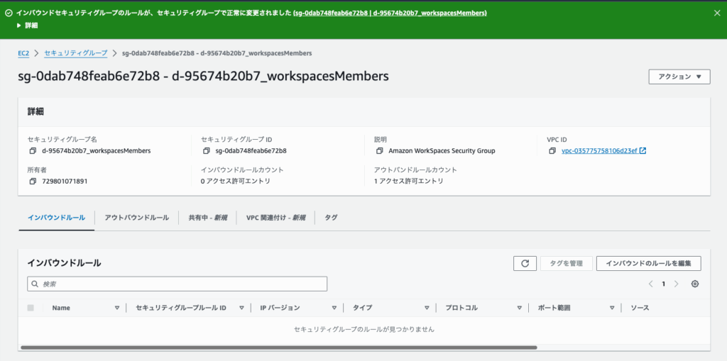 該当ENIに割り当たっているSGをクリックし、SG設定画面を表示させます。