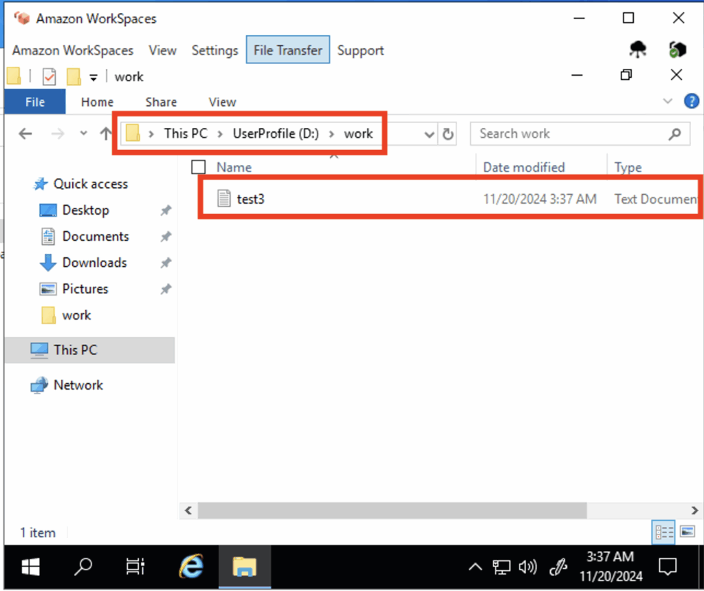 ファイルを受信したい場合は、WS内でファイル転送用フォルダに受信したいファイルを配置し[File Transfer]画面上で対象ファイルをダブルクリックします。本手順では、D:\workに配置します。