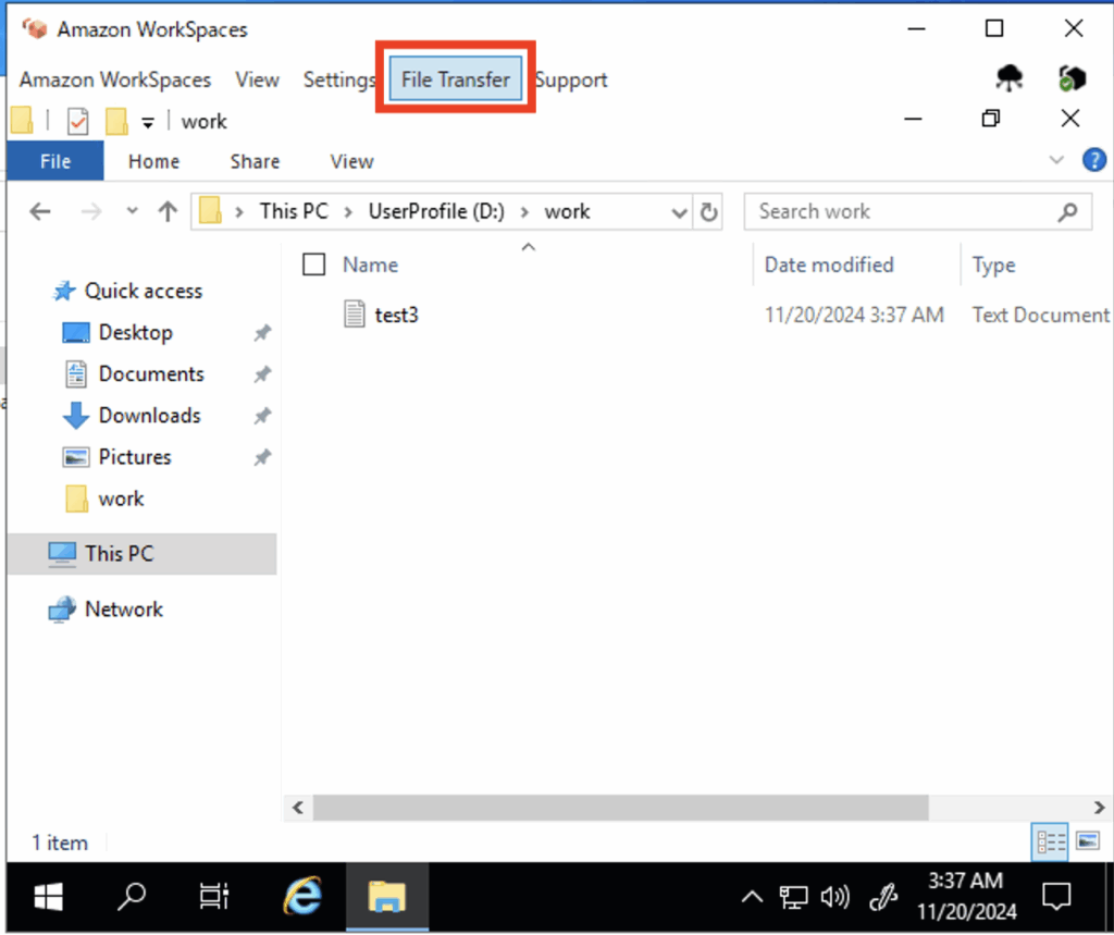 WorkSpacesクライアントのメニューバーにある[File Transfer]をクリックします。