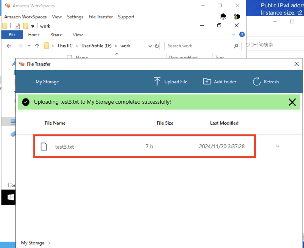 ファイルを送信したい場合は、この画面にWSに送信したいファイルをD&Dします。送信したファイルはWSのファイル転送用フォルダに配置されます。本ブログでは、D:\workに配置されます。
