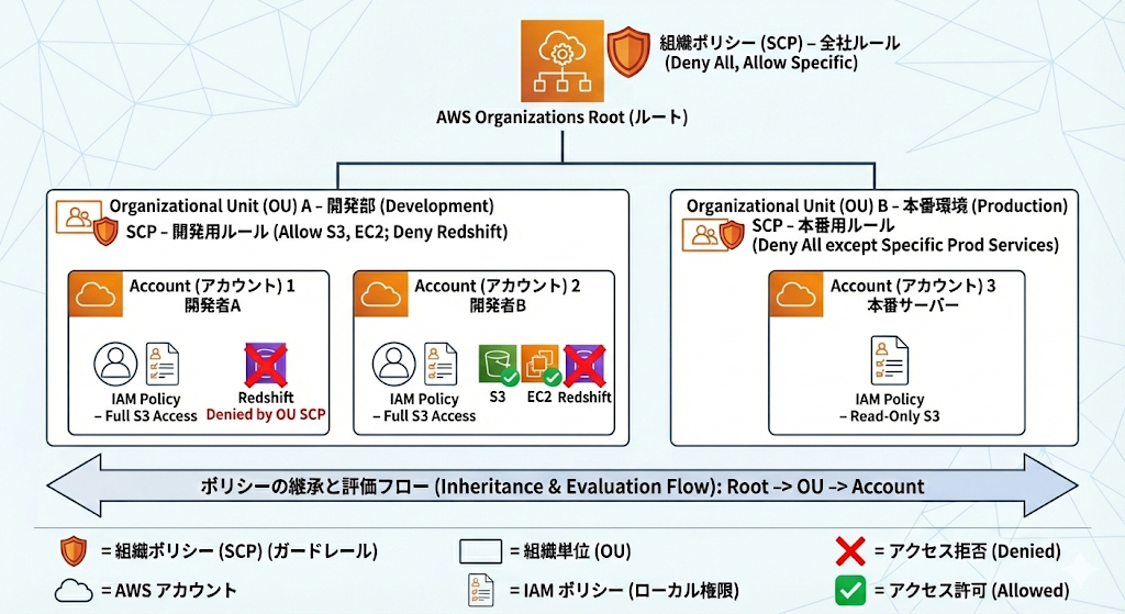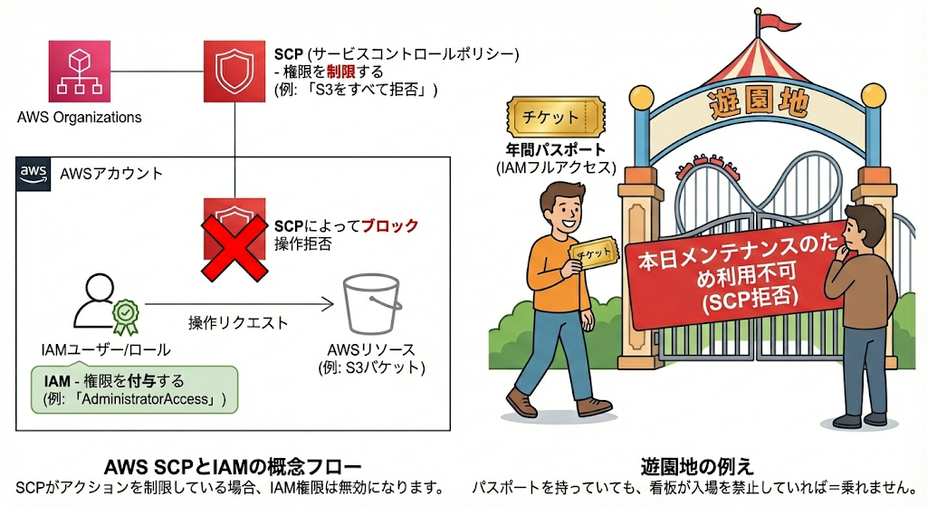 IAMでどんなに強い権限を持っていても、SCPで「ダメ」と言われたら、その操作は実行できません。例えるなら、遊園地の年間パスポートを持っていても、「本日メンテナンスのため利用不可」の看板があれば乗れないのと同じです。