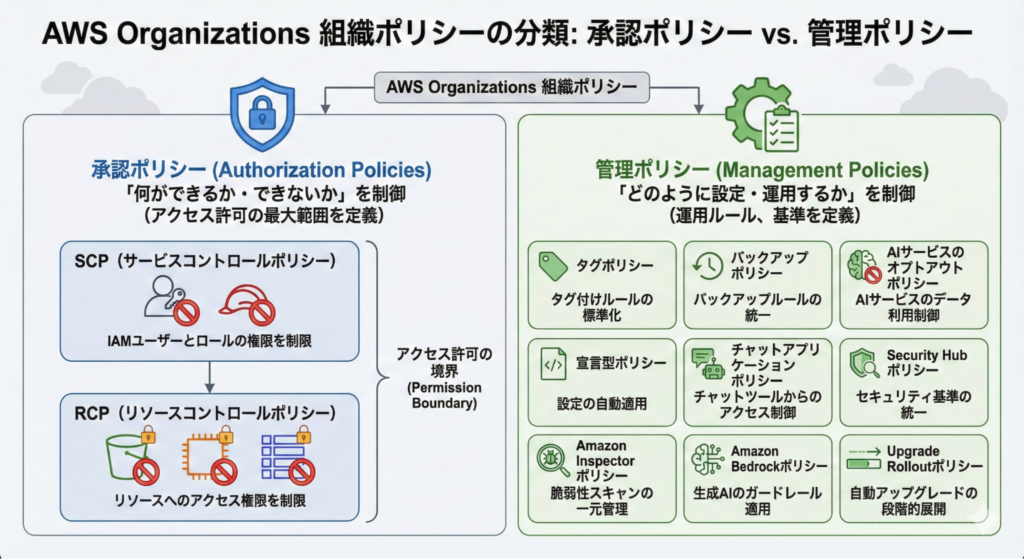 AWS Organizationsの組織ポリシーは、大きく「承認ポリシー」と「管理ポリシー」の2つのカテゴリに分類されます。