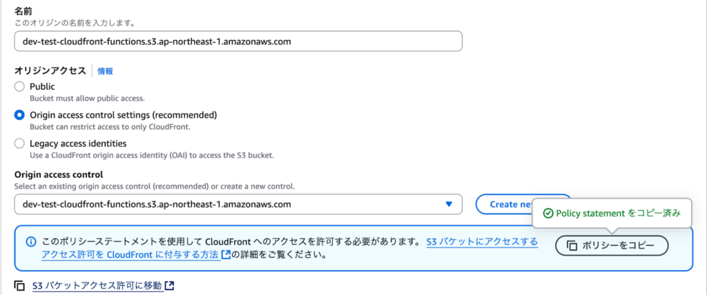 次にメンテナンス画面表示用の S3 を第2のオリジンとして設定してください。またオリジンアクセス設定は推奨値である「 Origin access control settings (recommended) 」にしてください。さらに「 create new OAC 」を押下し OAC を作成するとそのままバケットポリシーをコピーできるので、「 S3 バケットアクセス許可に移動」からバケットポリシーを設定してください。