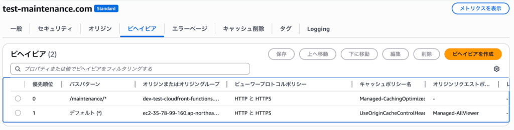 パスパターンは「 /maintenance/* 」、オリジンは dev-test-cloudfront-functions 、ビューワープロトコルポリシーを「 HTTP and HTTPS 」に設定し、後はデフォルトのまま作成します。