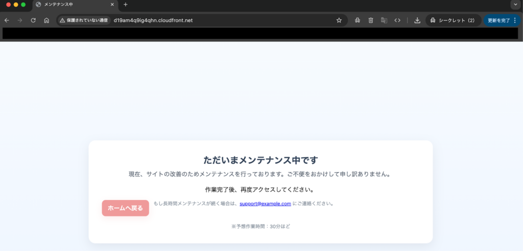 S3 に格納されているメンテナンス画面に遷移しました。事前に設定しておくと、万が一 EC2 が停止してしまっても、このように自動的に遷移してくれることがわかりました。ちなみに、EC2 が停止してからメンテナンス画面に遷移するまでは、約 3 分ほどかかっています。