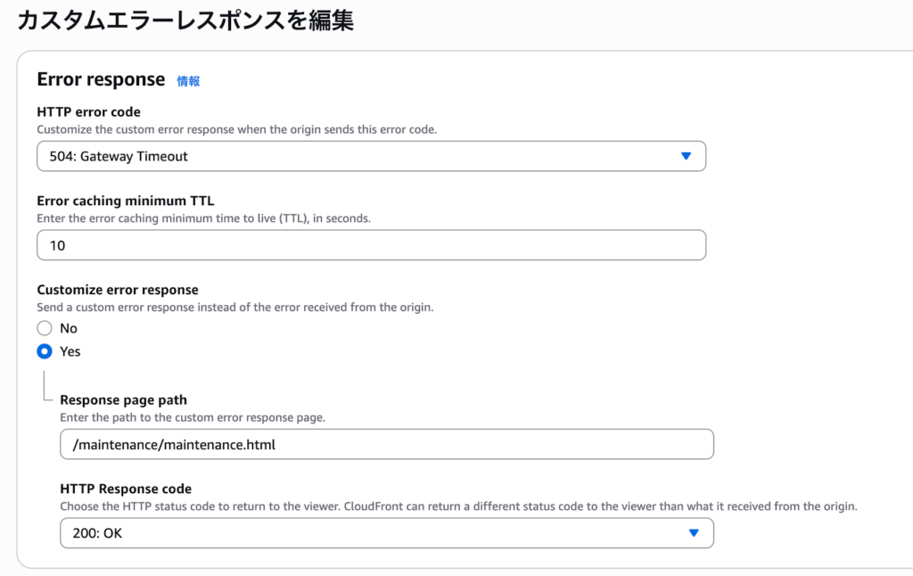 504 エラーが生じた際に、S3 の /maintenance/maintenance.html を表示するように設定します。