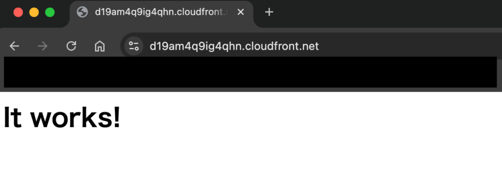 繰り返しになりますが、現在 CloudFront ディストリビューションドメイン にアクセスすると、EC2 が正常に稼働しているため「 It works! 」が表示されます。