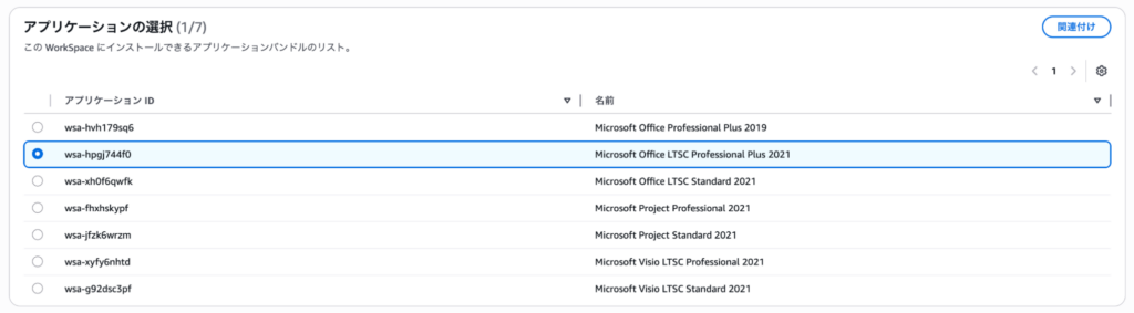 4.続けて「現在のアプリケーション」の下の「アプリケーションの選択」より利用する Office 製品を選択します。ここでは Microsoft Office LTSC Professional Plus 2021 を選択しています。その後右上の「関連付け」をクリックします。
