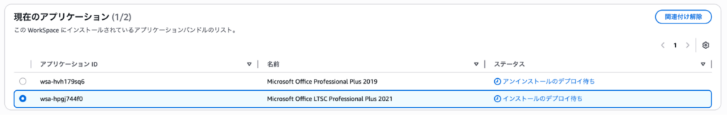 5.現在のアプリケーション内にて、Office 2019 が「アンインストールのデプロイ待ち」、Office 2021 が「インストールのデプロイ待ち」になっていることを確認します。