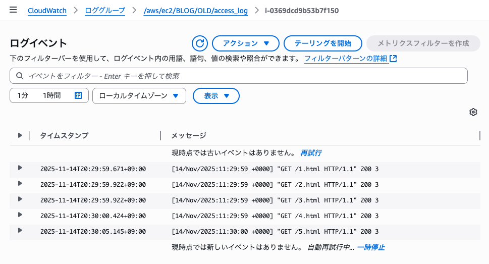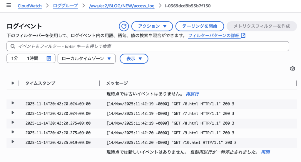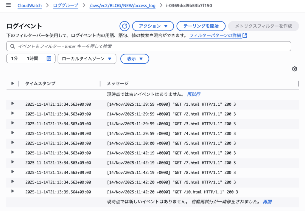 サーバ側のログは1~10.htmlまで1ファイルで揃っているので、新しいロググループには既存ログが保存されていないことが分かります。